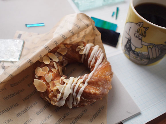 物置から以前使っていた大きい机を出してきて、 ガラスカットの机として使い始めました。 ついでに部屋のレイアウト変更。 北側の窓に面して設置したので柔らかな光の元、作業するのでちょっと快適に! お気に入りのおやつ。ミスドの…